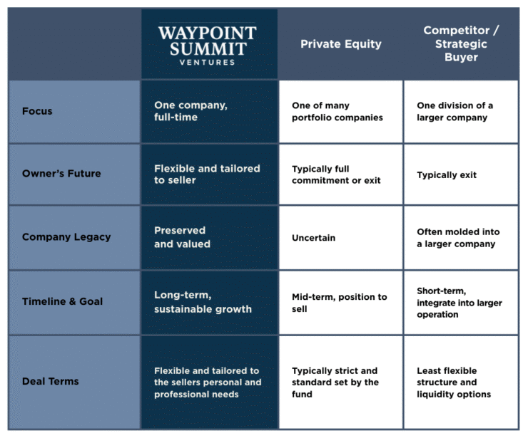 Waypoint Summit Ventures is dedicated to acquiring and actively operating a single great B2B service business. Our philosophy centers on people, trust, and shared values. We aim to preserve the company’s legacy while building sustainable, long-term growth for employees, customers, and the broader community.